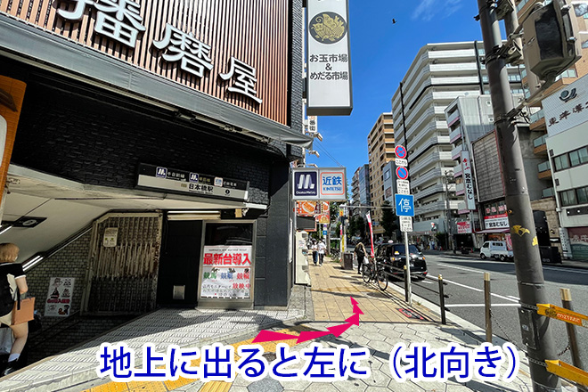 日本橋駅2番出口を出ると、日本橋1交差点の北東角です。堺筋を北の方向に進み約75メートルです。