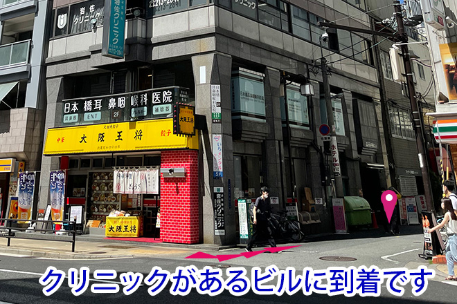 大阪王将さんお入っているビルの4階がクリニックです。道路に突出している看板があります。