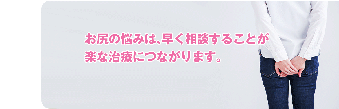 出血(紙に付く、便に付着する、下着に付くなど)、痛み、かゆみ、違和感、残便感、しこり、できもの、脱肛、膿が出る、粘液が出る、 便が出にくい、便が漏れるなど。これらの症状はひとつとは限らず、複数認めることもよくあります。